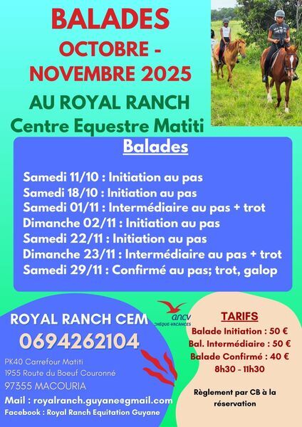 Balade Initiation, pour débutant, au pas : environ 3h = Approche du cheval, brossage, instructions pour la mise en place de la selle, du filet, Accompagnement en carrière sur les bases de la direction, de la position à cheval, puis départ en balade dans les champs, exploitation agricoles, forêt, savane, marais, selon les balades.